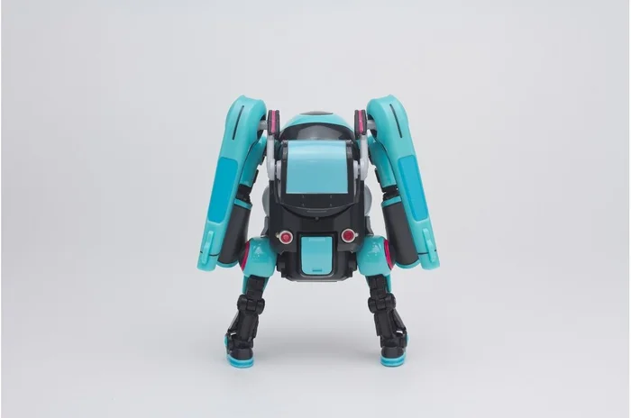 Miku is dwarfed by her new companion 35, but they could be mistaken for twins! Both enjoy the same color scheme, twin tails, and 35 even has its own leek! The Mechatro is also capable of multiple poses and even has a compartment that opens with a microphone, perfect for Miku to perform singing shows in the safety of an adorable robot!