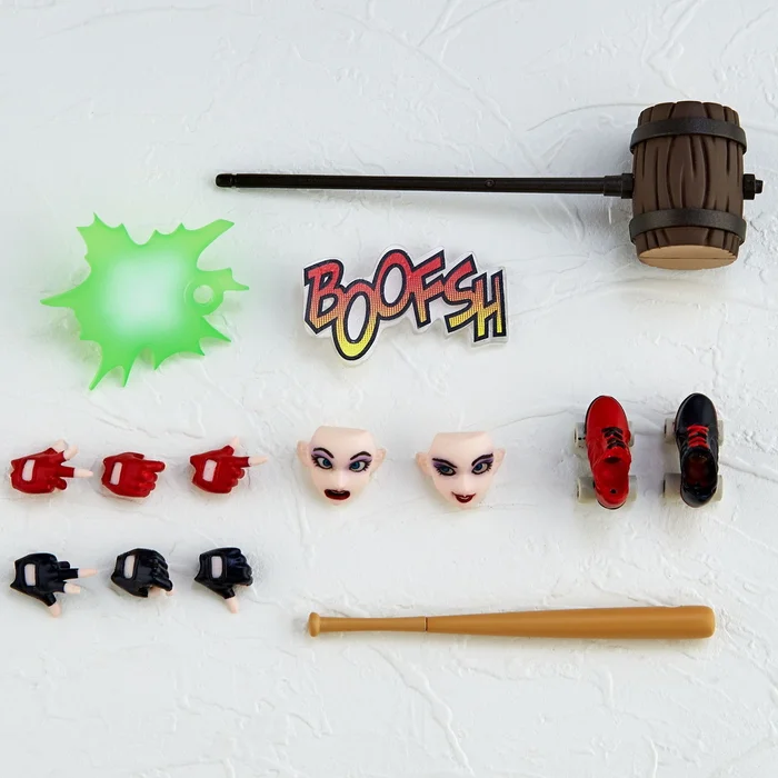 This Harley Quinn Amazing Yamaguchi figure from Kaiyodo is packed with posing possabilities! It not only is highly articulated so you can pose her in a variety of positions including sitting cross legged or wielding her weapons, but it also comes with three facial expressions, a hammer, a bat, an impact effect piece, an onomatopoeia “BOOFSH” piece, two shoes options (one of which are her roller blades), and six hands! Experty sculpted by Katsuhisa Yamaguchi, she has 40 points of articulation, 18 joints, and measures 5.9”. You can even move her pigtails and EYEBALLS! The paintwork is vivid and has a nice glossy effect too. A must-have for Harley Quinn fans!