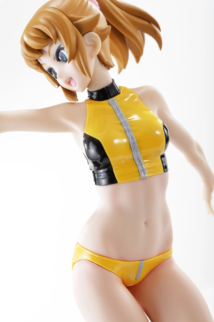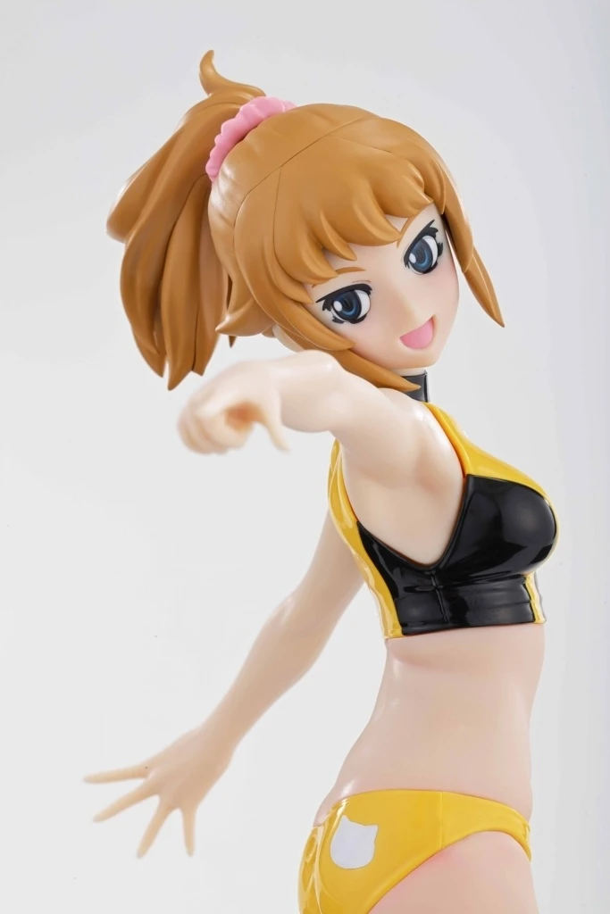 The first entry is the heroine Fumina Hoshino from Gundam Build Fighters Try! The layered injection features a semi-translucent property to allow a level of visual warmth and shadow to replicate the nature of human skin, allowing for a beautiful smooth appearance. In addition, her cute swimwear and eyes are also layers of constructed plastic, further reducing need for paint and stickers. A display stand featuring clear blue plastic simulating a splash of water is included.
