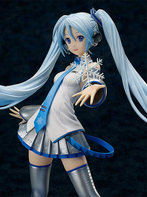 A huge 1/4th scale figure of Snow Miku, standing an impressive 16.5″ in height! The coloring of the popular Hatsune Miku figure has been switched over to the Snow Miku color scheme, with glowing skin and snowflake patterns added to various areas of her outfit creating a mystical atmosphere to the figure.