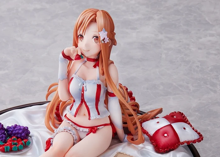 It looks like Sword Art Online‘s beloved heroine Asuna is spicing things up for Kirito with this 1/7 scale negligee figure! Asuna is dressed in frilly lingerie painted in her trademark white and red color scheme. While sitting comfortably on a round base of silky, ivory sheets, she playfully holds a strawberry up to her lips and smiles. Joining her on the bed is a plate of fruit, a diary, and a few decorative pillows that her long, luscious hair gently flows on top of. So if you want to have a snack with your snacc, this is the Asuna for you!
