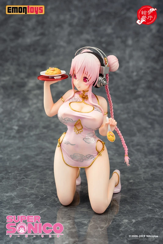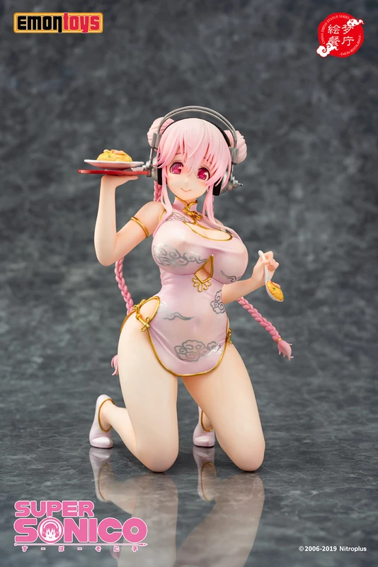 From Emontoys comes this 1/7 scale figure of Super Sonico sculpted by Yohei Katagiri (DMs). Measuring 7.1β, Super Sonico is posed on her knees with a plate and spoon full of veggie and shrimp yellow rice. Sheβs of course wearing her headphones, but also a pretty pink mini dress with a gold trim printed with a silver cloud pattern inspired by traditional asian style and has matching slippers on. Her hair is pulled up into two cute buns with long braids swaying down to her hips. How can you resist such a cute expression and delicious-looking noms? Add her to your collection!