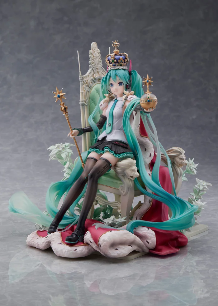 All hail Queen Hatsune Miku! Sculpted to 1/7 scale, the Vocaloid diva is finally crowned as she deserves to celebrate 3/9 – Miku Day! Inspired by the real life Crown Jewels, Miku-chan is wearing a jewel-encrusted golden head piece. In both hands, she carries a golden scepter and a Sovereign’s orb. These royal pieces are meticulously detailed, which can also be said of the ivory throne she sits atop. A host of delicate-looking flowers, a long red cape, and Miku’s gradient teal twintails add extra dimension and sophistication to an already gorgeous figure.