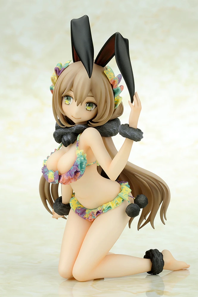 This cute character is the first in a series of collaborations between illustrators and sculptors. Based on an original character illustration by Arco Wada and sculpted by Koji Isumi, this adorable girl appears in a coquettish pose wearing a multicolored bikini with a black scarf and cuffs on her ankles and wrists plus cute bunny ears too! Perfect for bunny girl enthusiasts, this cute statue is a great addition to any collection.